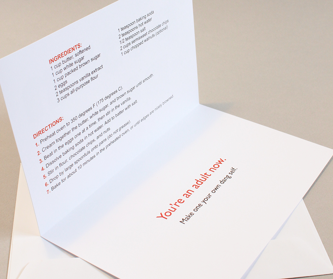 Inside: "You're an adult now. Make one your own dang self." (recipe on upper inside)